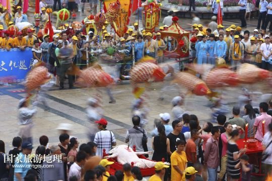 國家旅游地理 浙江寧波9月14日訊 9月14日,在浙江省寧波市象山縣,當(dāng)?shù)貪O民在進(jìn)行漁區(qū)民俗文化表演。當(dāng)日,浙江寧波象山縣舉行漁區(qū)民俗文化巡展,魚燈、馬燈、百獸燈、船燈等13支表演隊為游客奉獻(xiàn)了精彩的民俗表演,展現(xiàn)了象山燦爛的民俗文化和獨特的海洋風(fēng)情。 /新華社發(fā)(張培堅 攝)