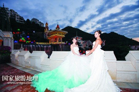 乘著電瓶車,從客天下廣場(chǎng)穿過雅致的圣山湖住宅區(qū),赫然出現(xiàn)在眼前的卻是大型婚禮殿堂,純歐式的建筑群隱匿在青山綠水中:乳白色的圓形屋頂、七彩斑斕的玻璃窗、富麗堂皇的大吊燈,見證了一對(duì)又一對(duì)新人走進(jìn)幸福的殿堂。在充滿異域風(fēng)情的幸福里大街,蘇格蘭風(fēng)笛表演、皇家馬車、中世紀(jì)格調(diào)的咖啡館,一幕又一幕,讓人恍若時(shí)空交錯(cuò)。