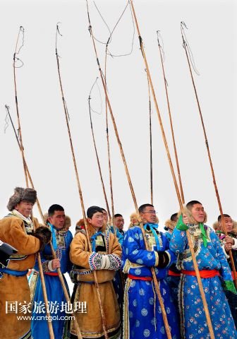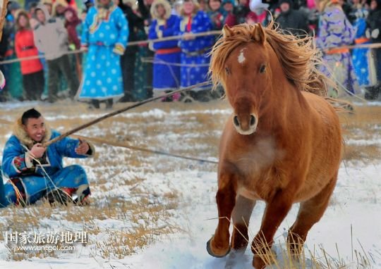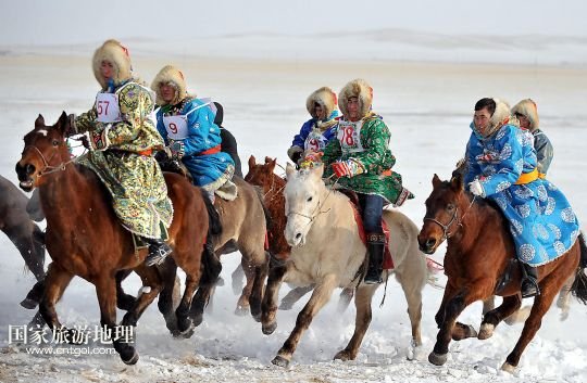 國(guó)家旅游地理 內(nèi)蒙古錫林郭勒1月5日訊 1月4日,牧民們?cè)谫愸R比賽中。當(dāng)日,2014年“銀色西烏珠穆沁”杰仁馬文化節(jié)在內(nèi)蒙古錫林郭勒盟西烏珠穆沁旗舉行。當(dāng)?shù)孛晒抛迥撩裆碇A麗的服飾,帶著自家的馬匹,冒著風(fēng)雪嚴(yán)寒,從四面八方趕到會(huì)場(chǎng),參加了賽馬、套馬、乘馬拾物、蒙古馬選美等多項(xiàng)比賽,吸引了來自全國(guó)各地的游客、攝影愛好者以及附近的大批牧民。 /新華社記者任軍川攝