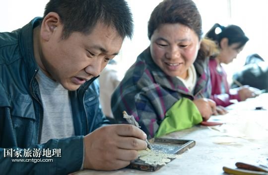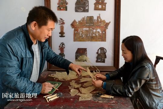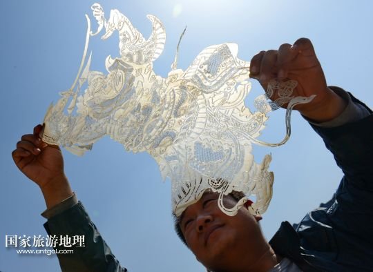 國家旅游地理 河北唐山4月2日訊 郭寶在檢查一件皮影藝術(shù)品的雕刻質(zhì)量(3月30日攝)。河北省遷安市趙店子鎮(zhèn)馬古寺村村民郭寶自幼喜歡皮影雕刻,師承當(dāng)?shù)氐窨趟嚾送跽淅舷壬窨痰挠叭嗽煨凸艠?、工藝精細,深受皮影收藏愛好者的歡迎。2003年,郭寶成立了“郭寶皮影傳承工作室”,并從村里招來20多位喜歡皮影藝術(shù)的農(nóng)民專門從事皮影雕刻。經(jīng)過幾年的發(fā)展,如今郭寶皮影工作室開發(fā)設(shè)計皮影工藝品3000余種,在傳承保護唐山皮影的同時還獲得了豐厚的收入。 /新華社記者楊世堯攝
