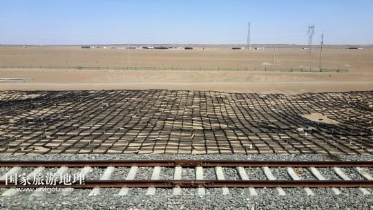 國家旅游地理 內(nèi)蒙古阿拉善4月21日訊 錯(cuò)落布局在內(nèi)蒙古臨策鐵路(臨河——策克)旁的網(wǎng)格沙障(4月18日攝)。穿越我國北疆內(nèi)蒙古阿拉善高原大漠的呼和浩特鐵路局臨策鐵路沿線有400多公里“無人區(qū)”,這里常年干旱少雨、風(fēng)沙肆虐、植被稀少、人跡罕至,30多萬平方公里的荒漠、戈壁縱橫交錯(cuò),自然條件極度惡劣。