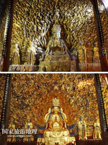 修復(fù)前后的重慶大足千手觀音造像全景(拼版照片,上圖上:2011年10月27日攝,上圖下:2015年4月4日攝)。