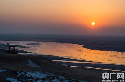 原標題:寒冬黃河寧夏黃沙古渡出現(xiàn)“落日繪流凌”美景