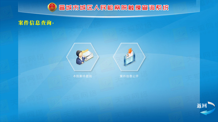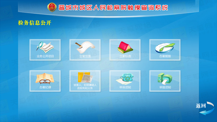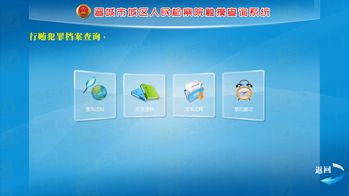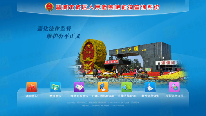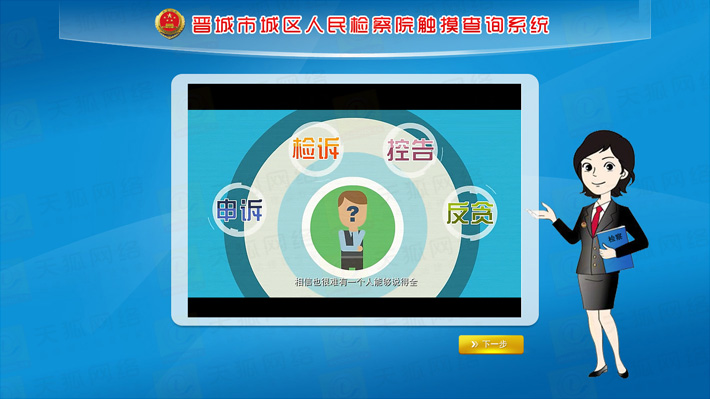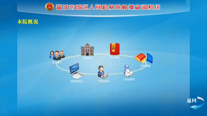 城區(qū)檢察院觸摸查詢系統(tǒng)分為前臺(tái)顯示模塊,動(dòng)畫(huà)效果展示模塊,后臺(tái)資料更新維護(hù)模塊,外部設(shè)備I/O模塊等五大部分。